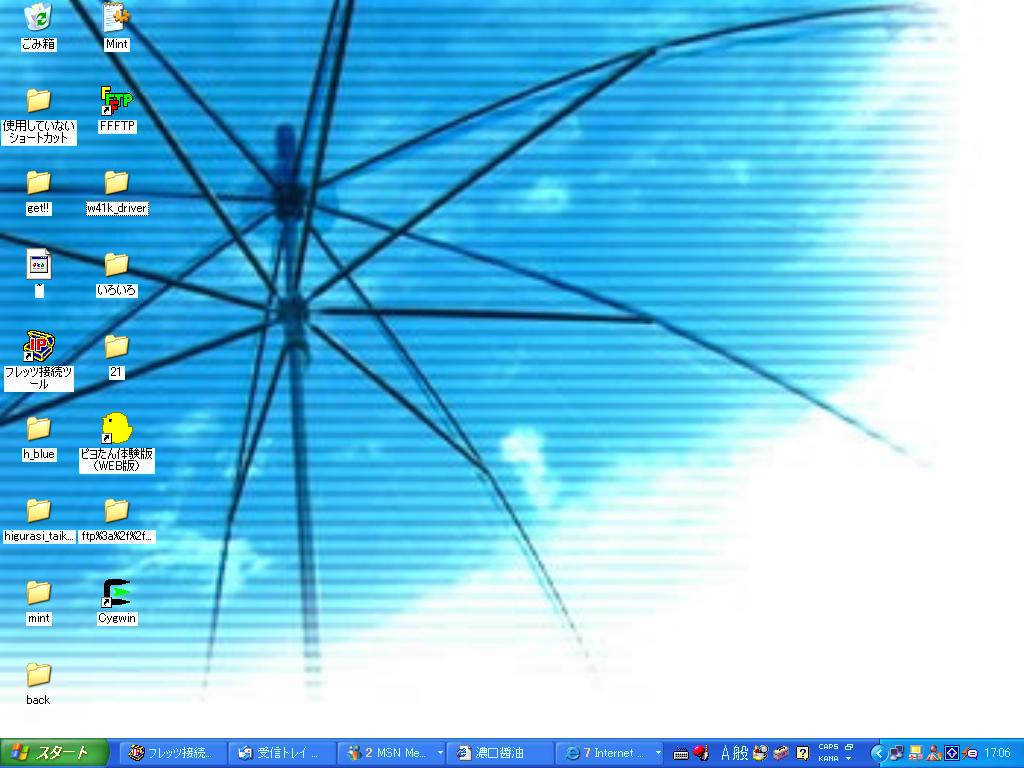 ふたみんからもらったデスクトップバトンです☆ 【1】あなたのデスクトップを晒して、一言どうぞ。 あーうん。超うそっぱちですこれ。 とりあえず使えそうなのを必死になって探して結果こちらを起用。雨の日~の背景に使ってたやつです。 本当に使ってるのはここで晒したら違法なので。 【2】OSは何? 窓のXPです。 【3】これはあなた個人のパソコン?職場や家族共有のパソコン? 家族でまともにPC使えるの私だけという事情もあり専用機です。 【4】この壁紙は何?どこで手に入れた? 傘だと思いますよ。 「空に咲く花」さんからお借りしてます。リンクページから飛べるんでよろしければ。サイトでもかなり多用してます。 【5】壁紙は頻繁に変える? あまり変えないほうかと。 多分最近変えてないかな。 つか今使ってるの前がだいぶ長かった。某銀髪王子が半年くらいデスクトップに居座ってた。その前はふつーのでさらに前はニ美たんから頂いたやつを使ってました(笑) 【6】デスクトップのアイコンの数はいくつ? 17個……?数えたんだけどあってるかな。 最近色々ダウンロードしたからそれが出てるね。 【7】ファイルやショートカットがゴチャゴチャしている もっぱらネットにしか使わないのでゴチャつくほどファイルもショートカットもありません(にこ) 【8】何かこだわりはある? 素敵絵には絶対アイコン乗っけないようにしてます。 【9】今回、このバトンが回ってきてからこっそりとデスクトップを整理した? ええしましたがそれが何か? 個人で使用するのはともかく日記で晒すのは明らかに違法ですからね。ふかこーりょくです。 【10】最後に『この人のデスクトップを覗きたい』という5人 ニ美たんのご期待にこたえて。 諷鴉、有馬たん、那月ちゃん(sinちゃんの先手を打って 笑)、 御蔭ちゃん(やっぱり先手必勝 笑)、くろたん(ブログで答えるといいさー) がっつり5人(にこ) みんなもあわてて壁紙変えるといいよ(にこ) PR ちくしょう出来るかよあんなプログラミング出来るかよ!!しかも提出日ドイツ語のテストともろ被りとかなんなのさーー。
